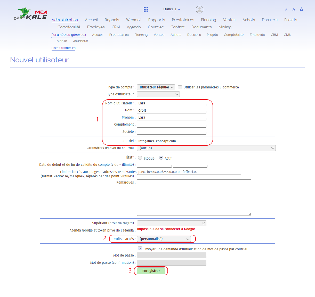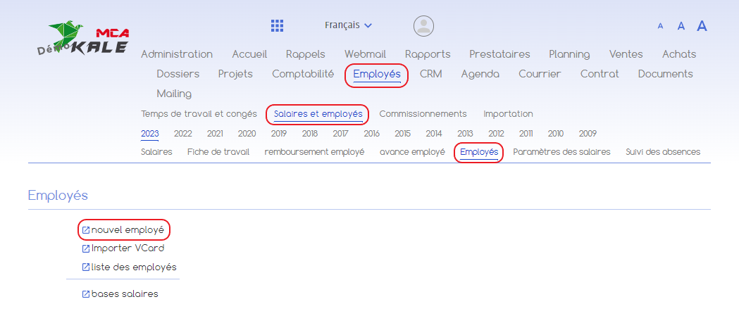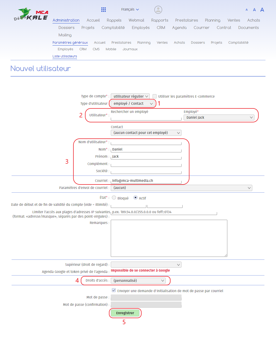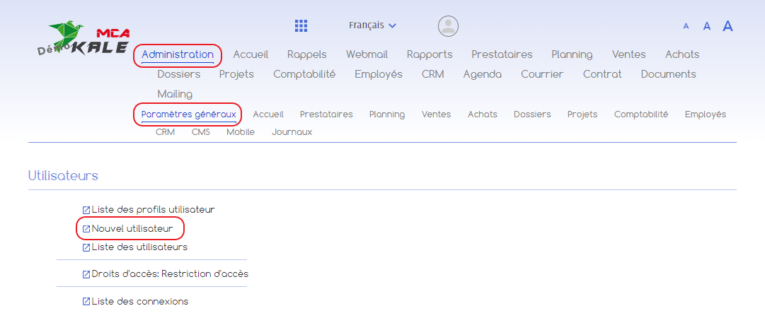 Ce guide présente l’ajout d’un utilisateur employé ; vous pouvez cependant appliquer la même procédure si vous souhaitez créer un compte utilisateur pour un client, prestataire, fournisseur, etc. Il vous suffit d’adapter les termes utilisés ici en fonction du contact choisi.