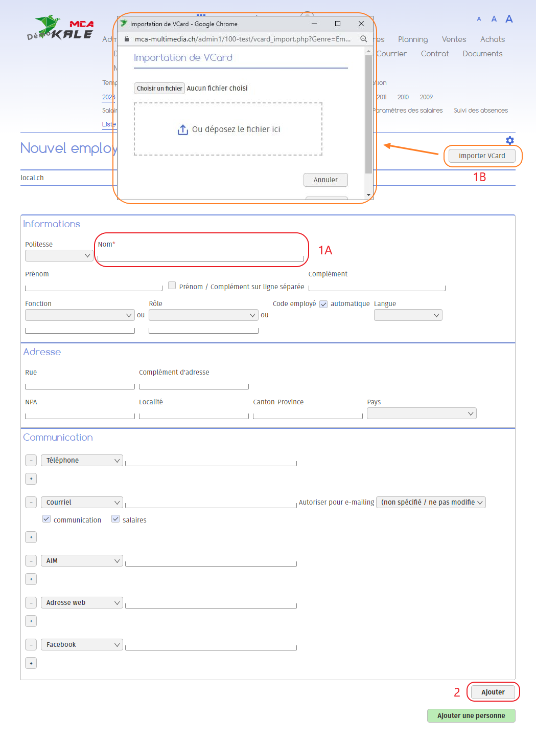La vidéo ci-dessous vous montre comment procéder à l’importation d’une V-Card pour un client. Le processus reste le même pour un employé.