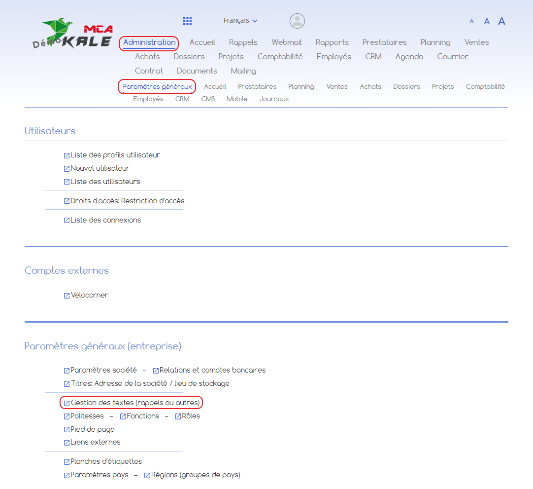 Allez dans « Administration », puis « Paramètres généraux » et cliquez sur « Gestion des textes (rappels ou autres) ».