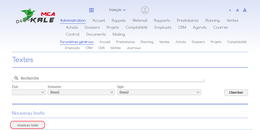 Cliquez sur « nouveau texte » pour créer un nouveau modèle.