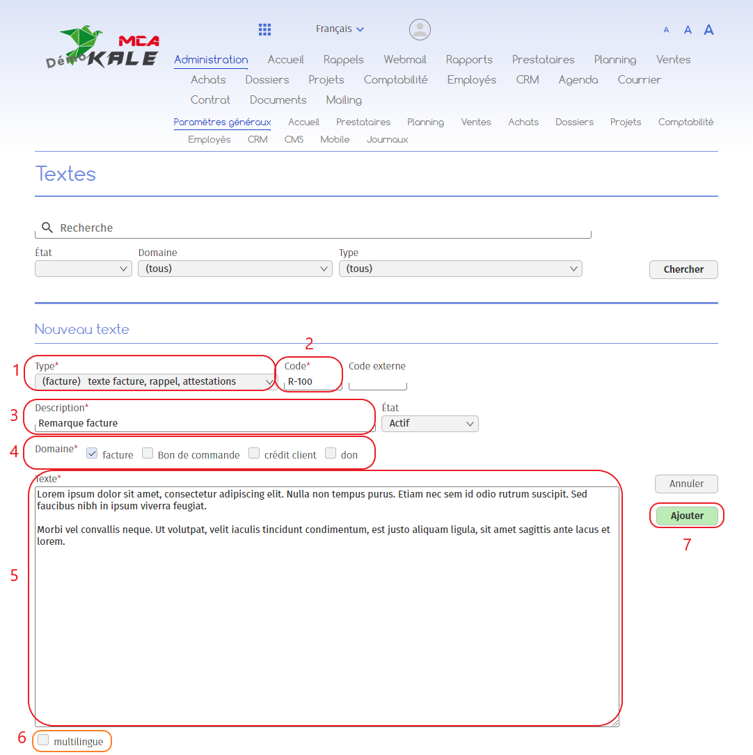 Ce chapitre vous explique comment créer des modèles de texte que ce soit pour les rappels de paiement, les formules de politesse, les salutations, les courriels, etc.