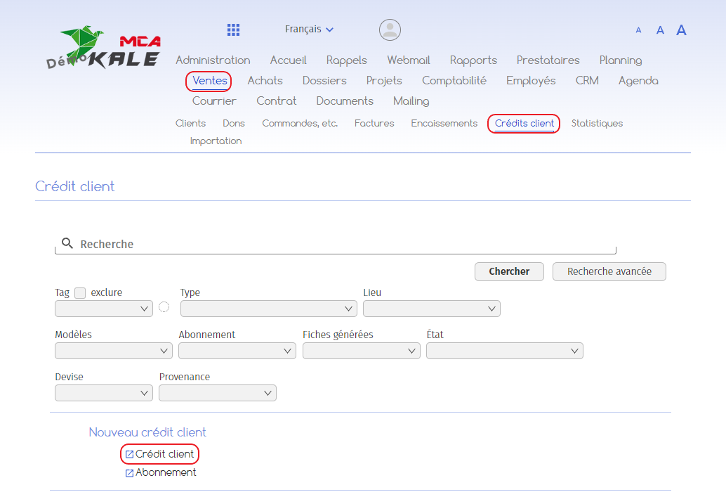 Pour créer une note de crédit client, allez dans le menu « Ventes », puis « Crédits client ». Sous « Nouveau crédit client », cliquez sur « Crédit client ».