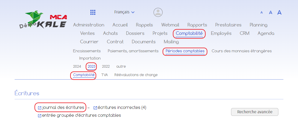 Le journal des écritures est accessible via les menus Comptabilité > Périodes comptables > [année en cours] > Comptabilité. Cliquez sur le lien « journal des écritures » afin d’ouvrir ce dernier.